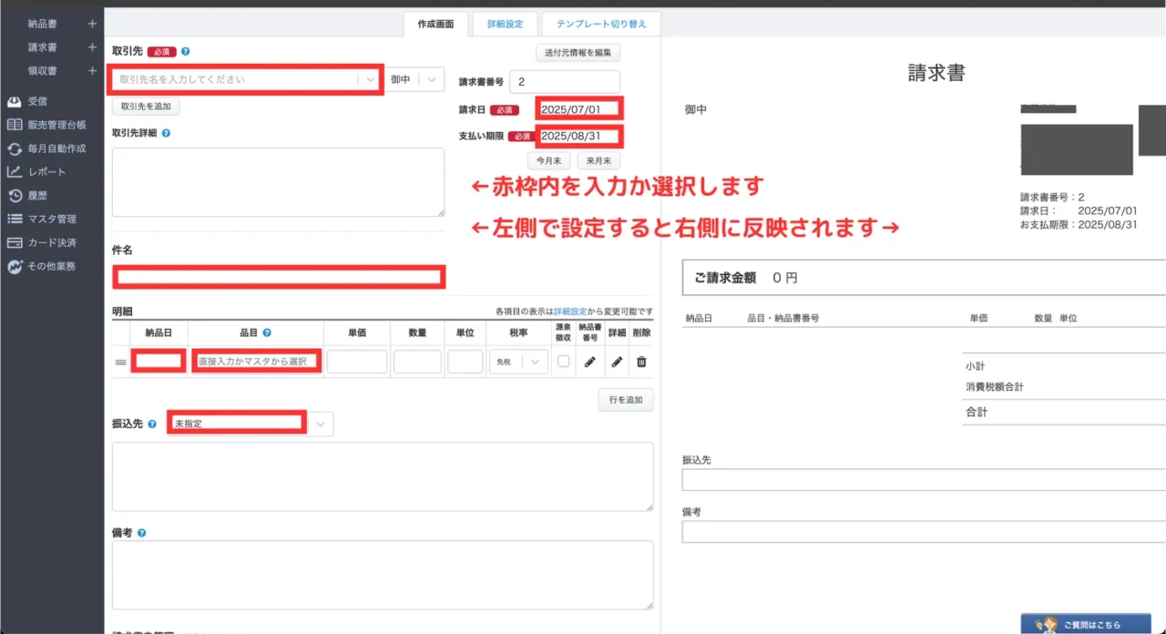 初期設定と取引先・品目の登録が終わったら、いよいよ請求書の作成に進みます。