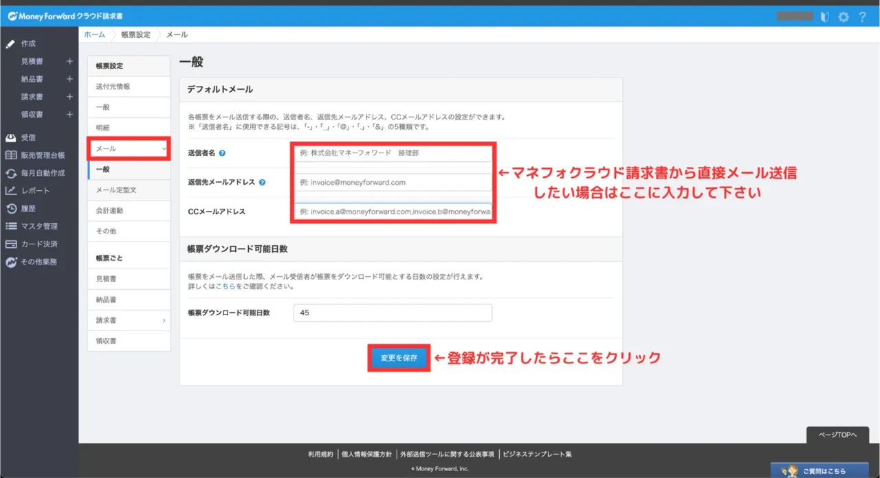 - 帳票設定 > メール:送信者名・返信先メールアドレス・CCアドレスなどを登録