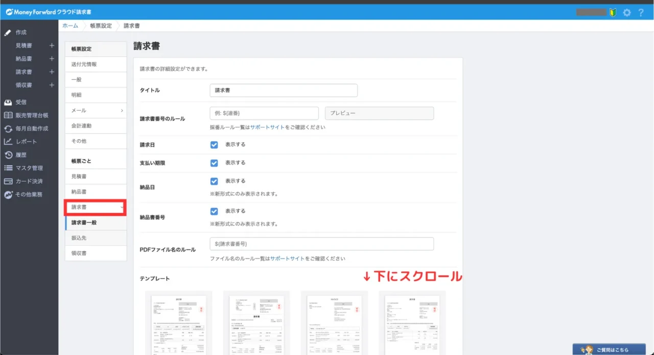 - 帳票設定 > 請求書:請求書のテンプレートを選択・設定